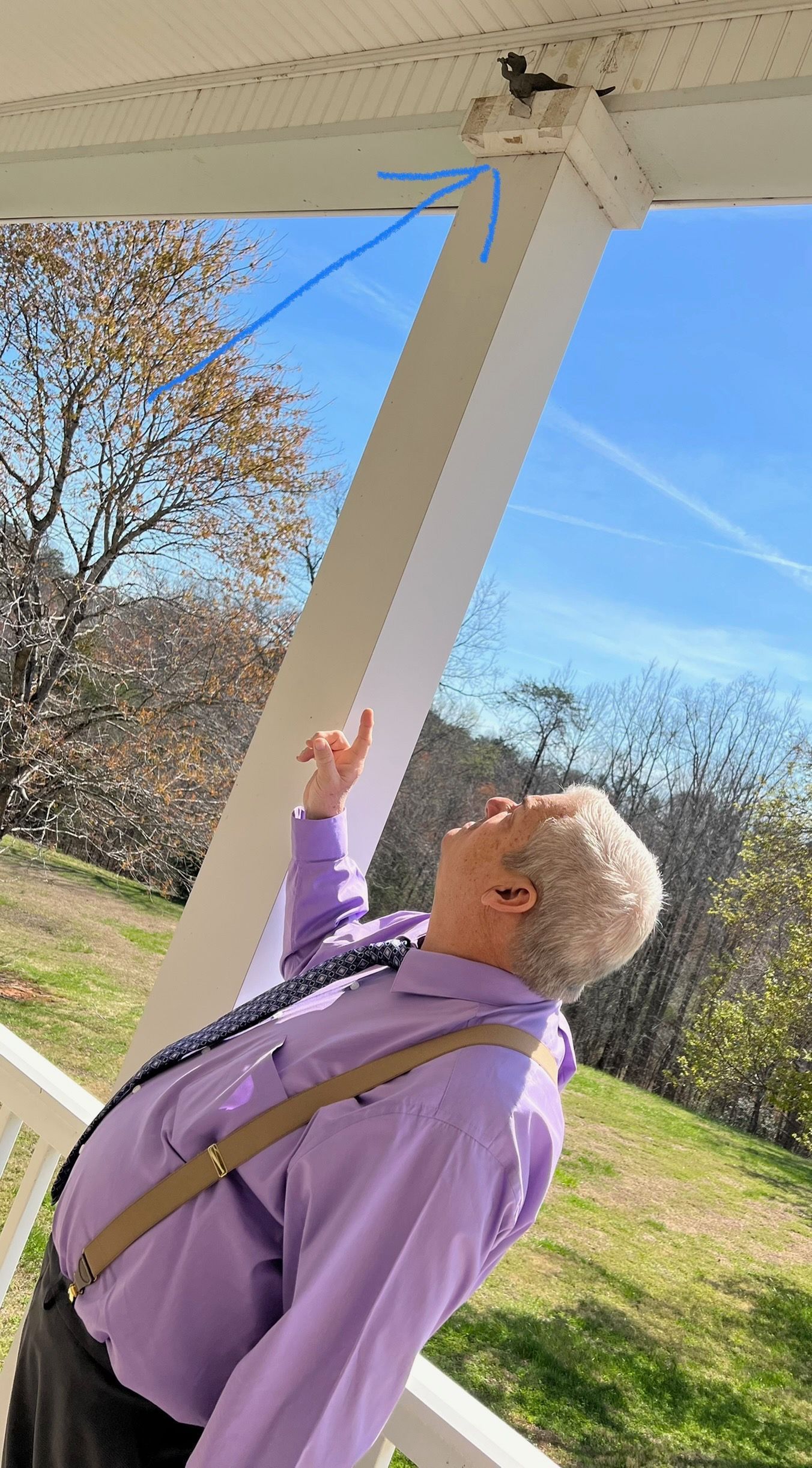 What he is pointing at here requires some explanation. On top of the columns here at the mortuary, I was having problems with birds building nests each year. Neil happened to be over one day when I was probably on a ladder using tape to tape the area up to discourage such construction, when he suggested that I use snakes. Rubber snakes. He said to go to the dollar store of my choice and invest in rubber snakes, put said snake on the ledge of the column and the birds would be discouraged from building by this frightful rubber snake.